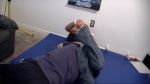 Having showered after her shoot, JC wraps up Rob in an unplanned match, scissoring and sleepering him then taking the camera from the tripod, where he was testing a shot, after about 6 minutes. Holding the camera, she KOs him again and again in her long surfer legs wearing jeans her quads can be seen flexing beneath, her white-socked feet locked out at full power. He begs her to take it easy. She just answers "No." She tells him "I'll never let you go." And she means it. Rob is relegated to begging the ruthless 6"ft 19-year-old to let him go after she KOs him. JC is the definition of dominant. Time: 24:26